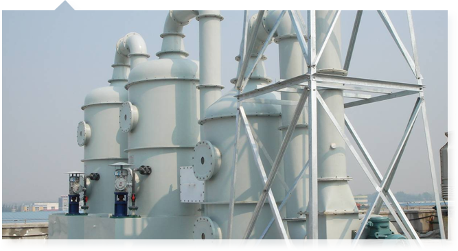 3未被吸收的酸/碱性气体进入第二层,在喷淋段中吸收液被均布的喷嘴高速喷出,形成无数细小雾滴与气体充分混合、接触、继续发生化学反应,与第一层类似吸收过程;